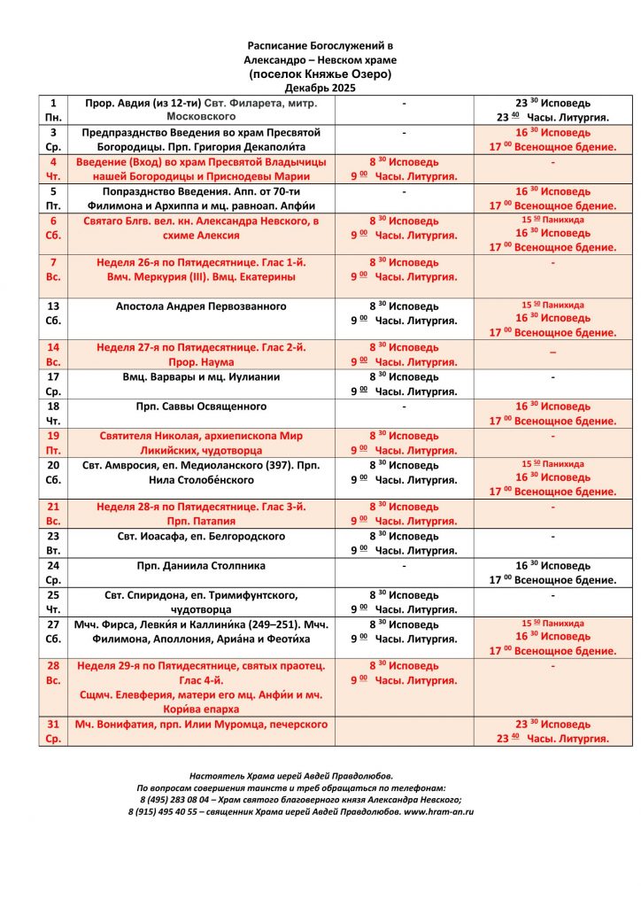 Расписание Богослужений